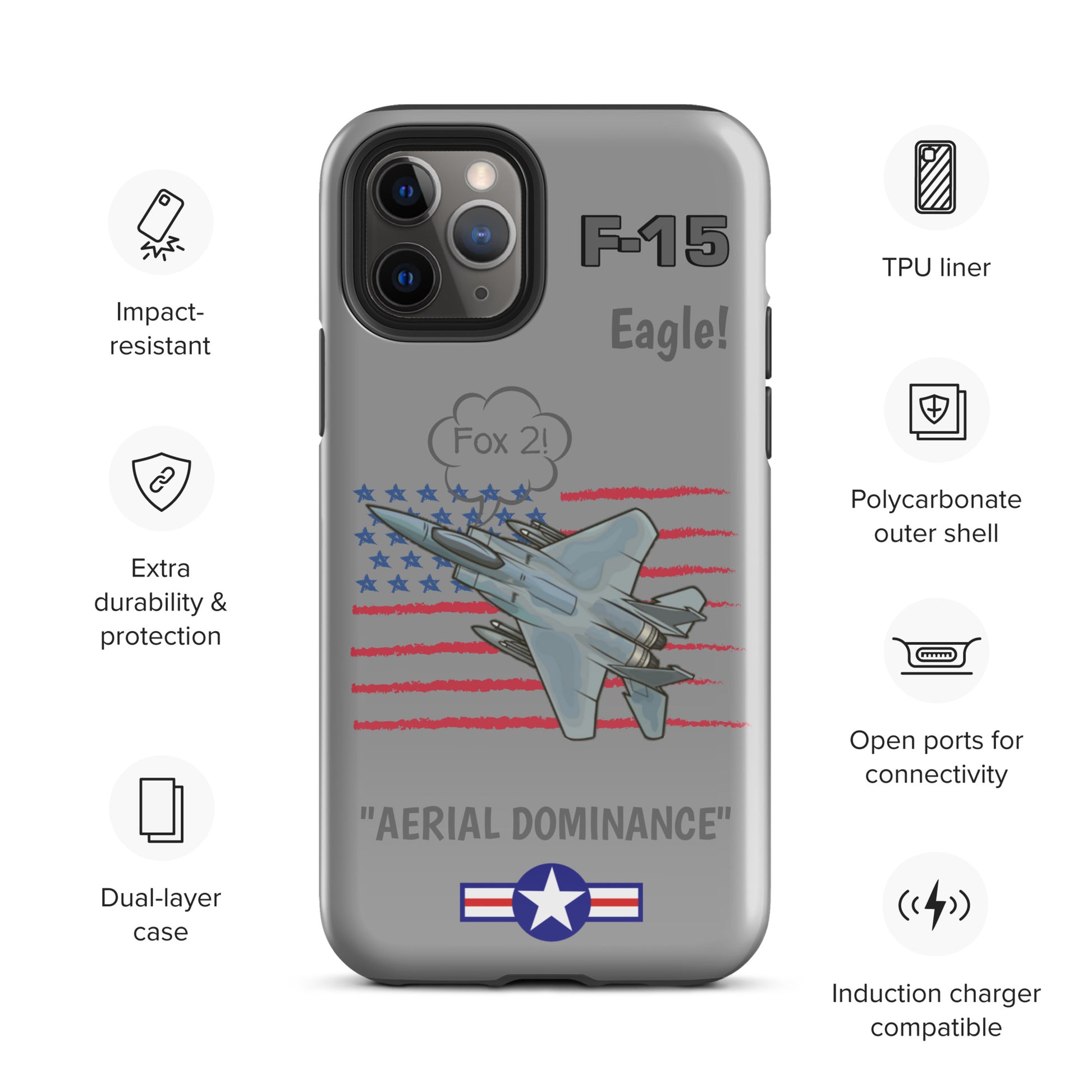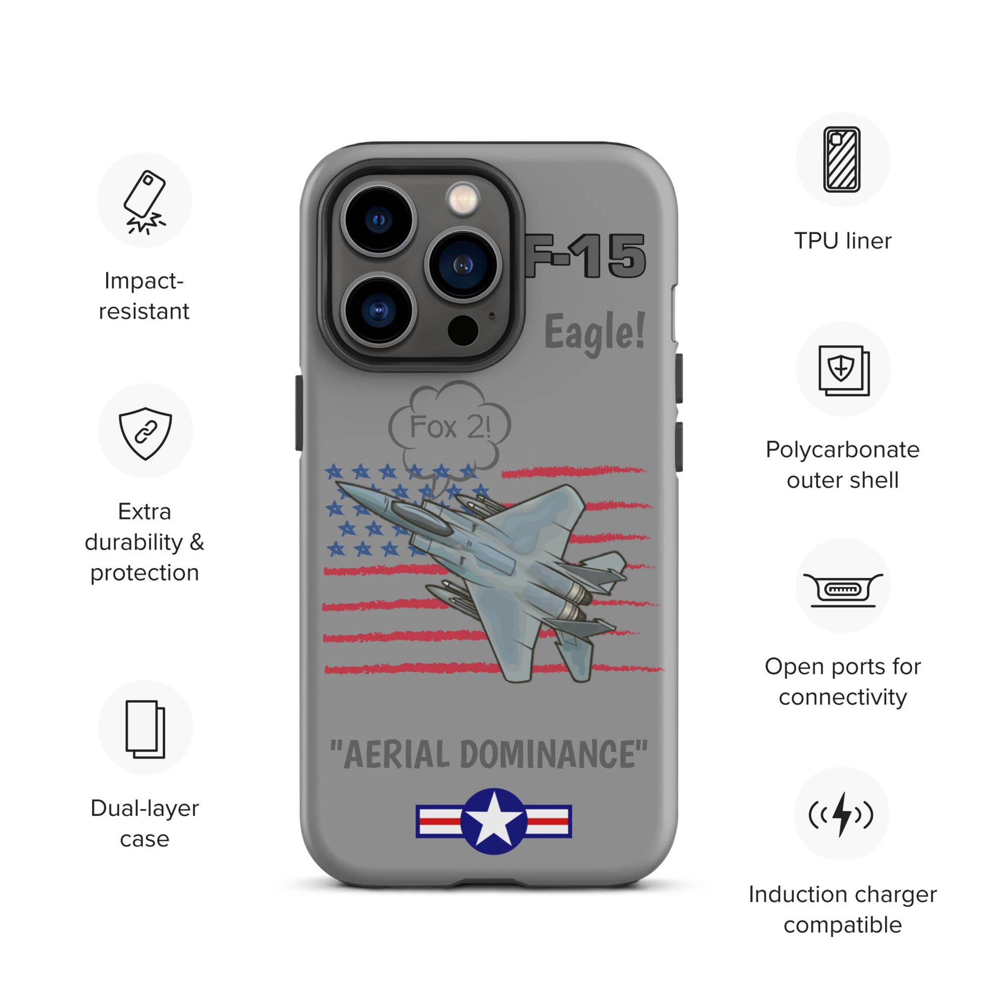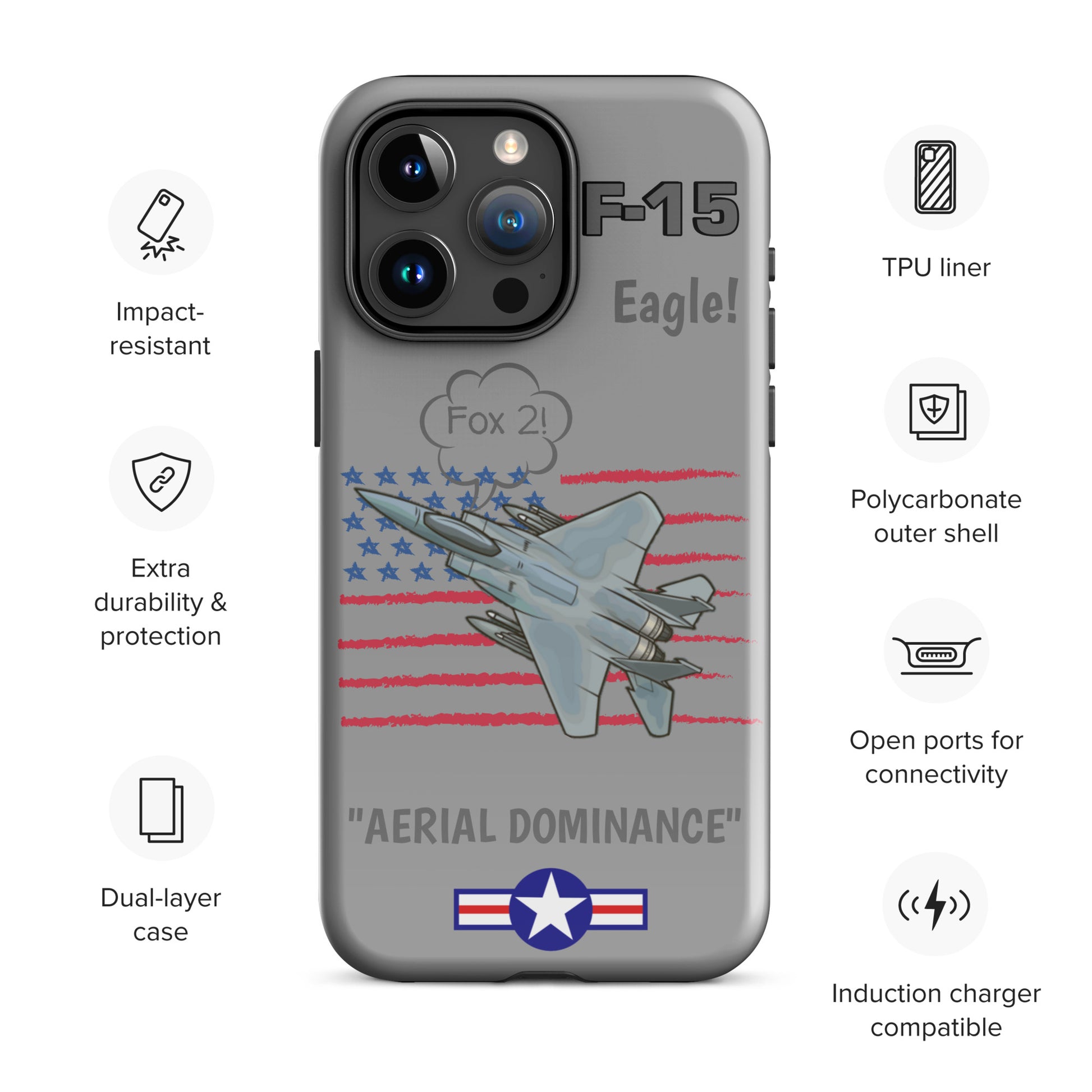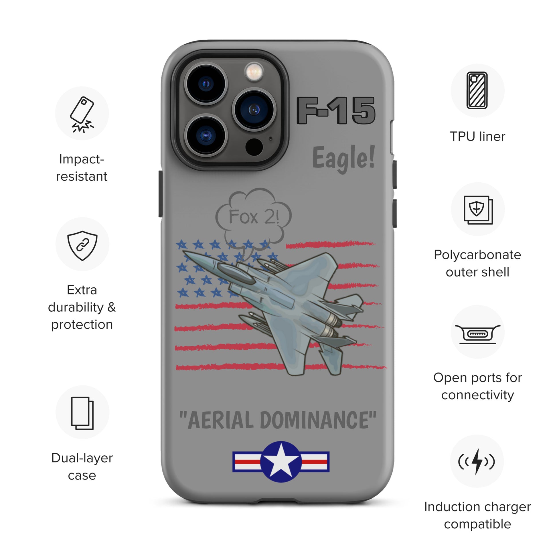 Elevate your iPhone's defense with our F-15 Eagle Inspired Phone Case. Imbued with the strength of the iconic F-15 aircraft and adorned with the stars and stripes of the USA flag, this case combines style and protection seamlessly. Safeguard your device with the spirit of aviation and patriotism, showcasing your pride in both technology and country.