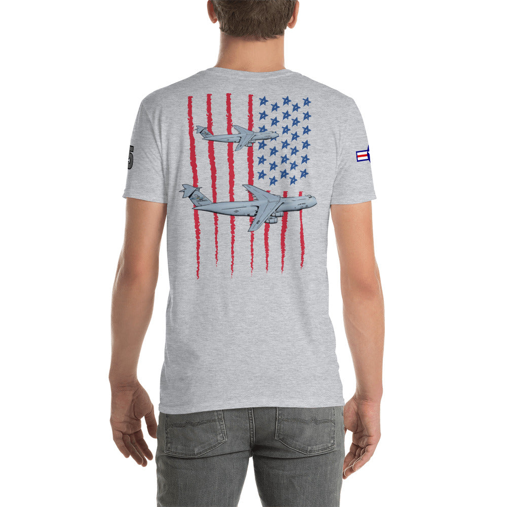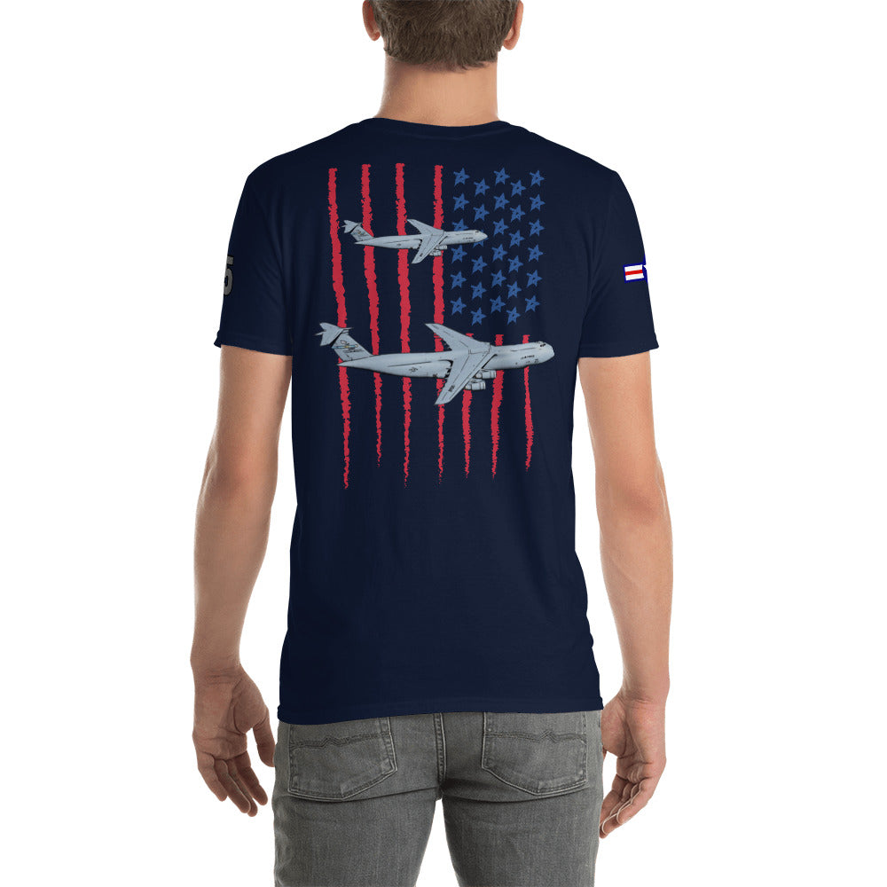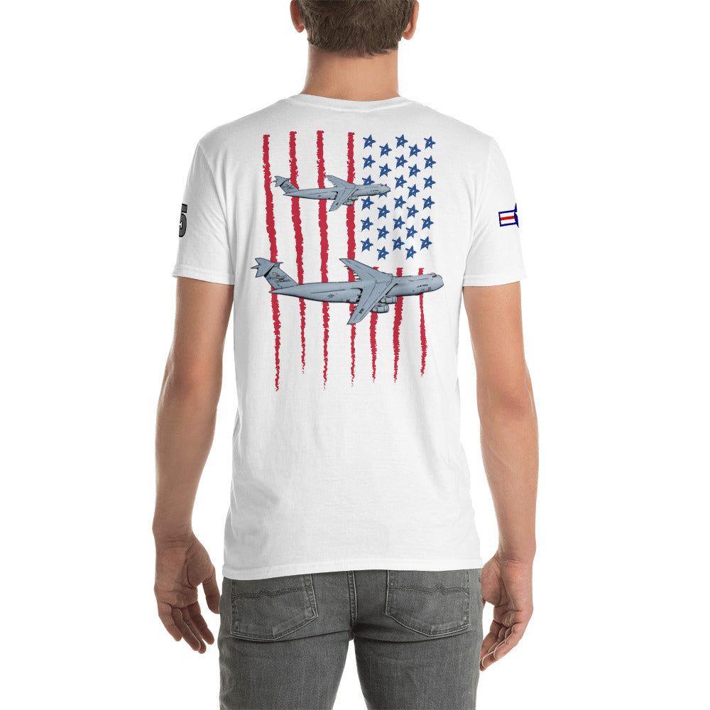 Elevate your style with our C-5 Galaxy Patriot T-Shirt, a tribute to the incredible might of American aviation. This shirt proudly features the iconic USA flag as a backdrop to the legendary C-5 Galaxy. Crafted for both comfort and style, it's the perfect way to showcase your admiration for this colossal aircraft and the spirit of aviation. Embrace the legacy of aerial excellence and make a statement with every step you take.