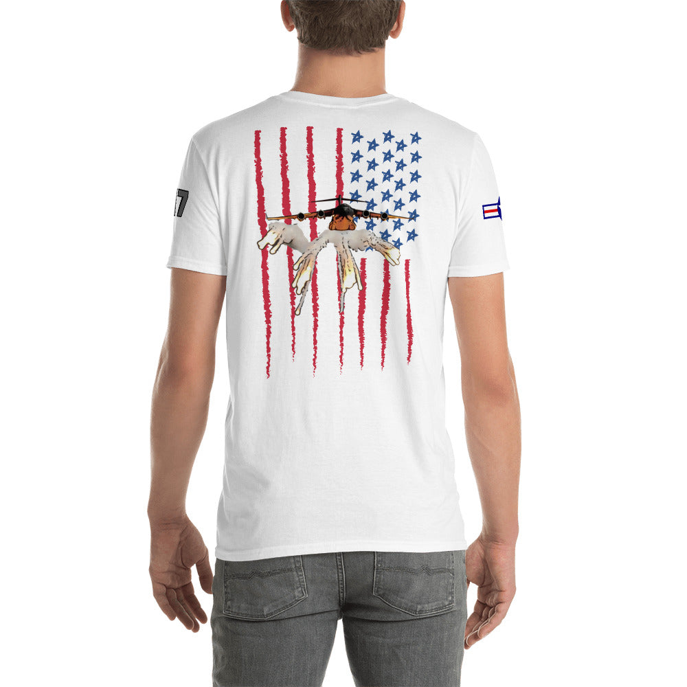 Elevate your style with our C-17 Globemaster Patriot T-Shirt, a tribute to the strength and versatility of American aviation. This shirt proudly displays the iconic USA flag as a backdrop to the legendary C-17 Globemaster. Crafted for both comfort and style, it's the perfect way to showcase your admiration for this remarkable aircraft and the spirit of aviation. Embrace the legacy of aerial excellence and make a statement with every step you take.