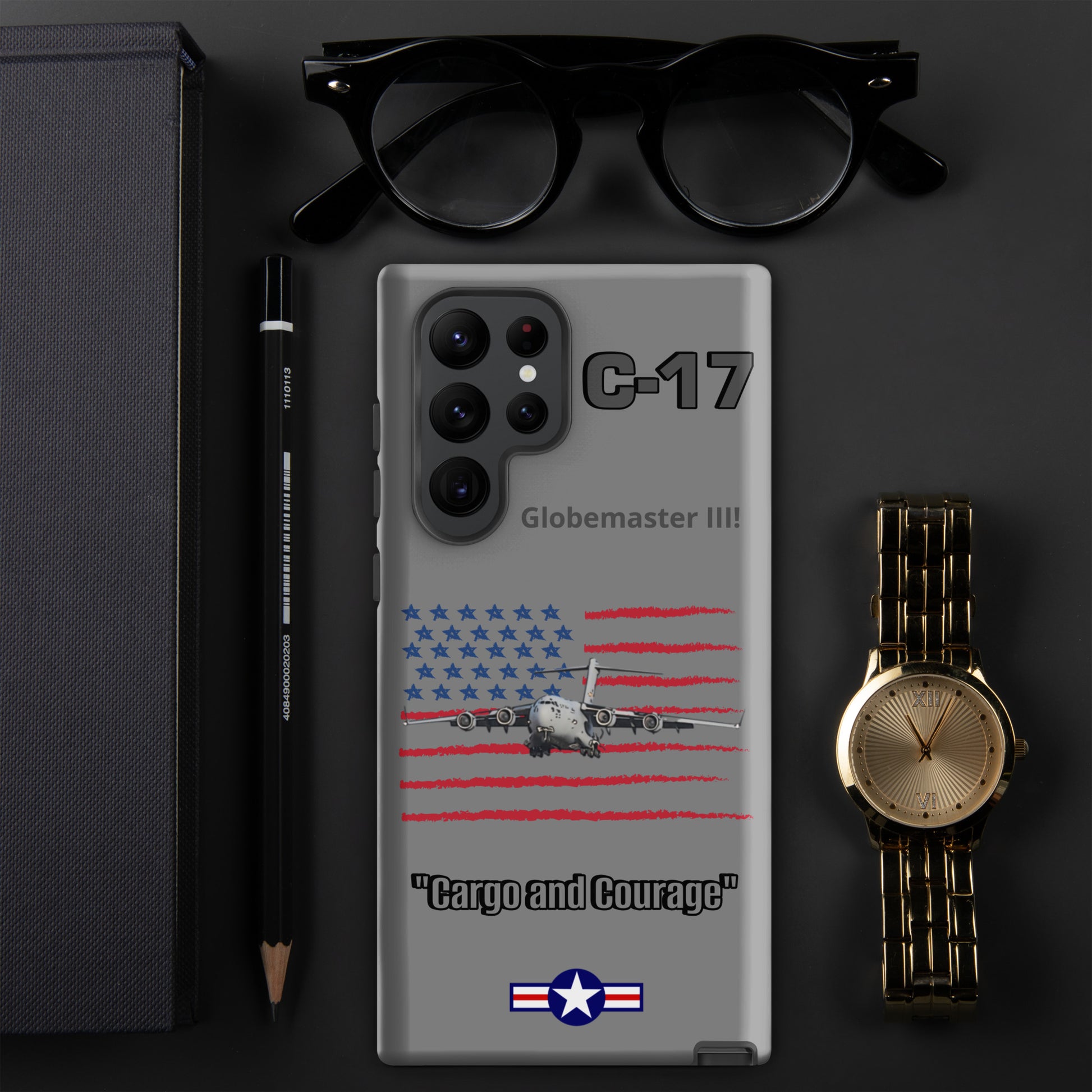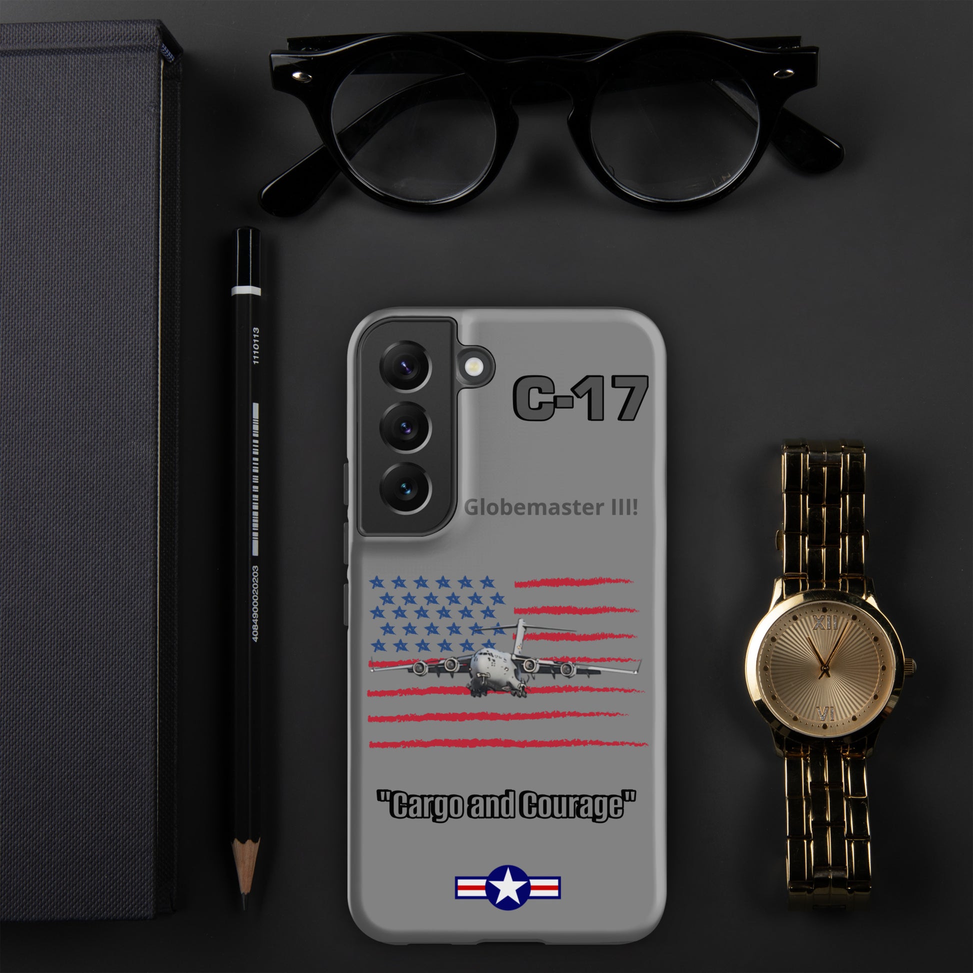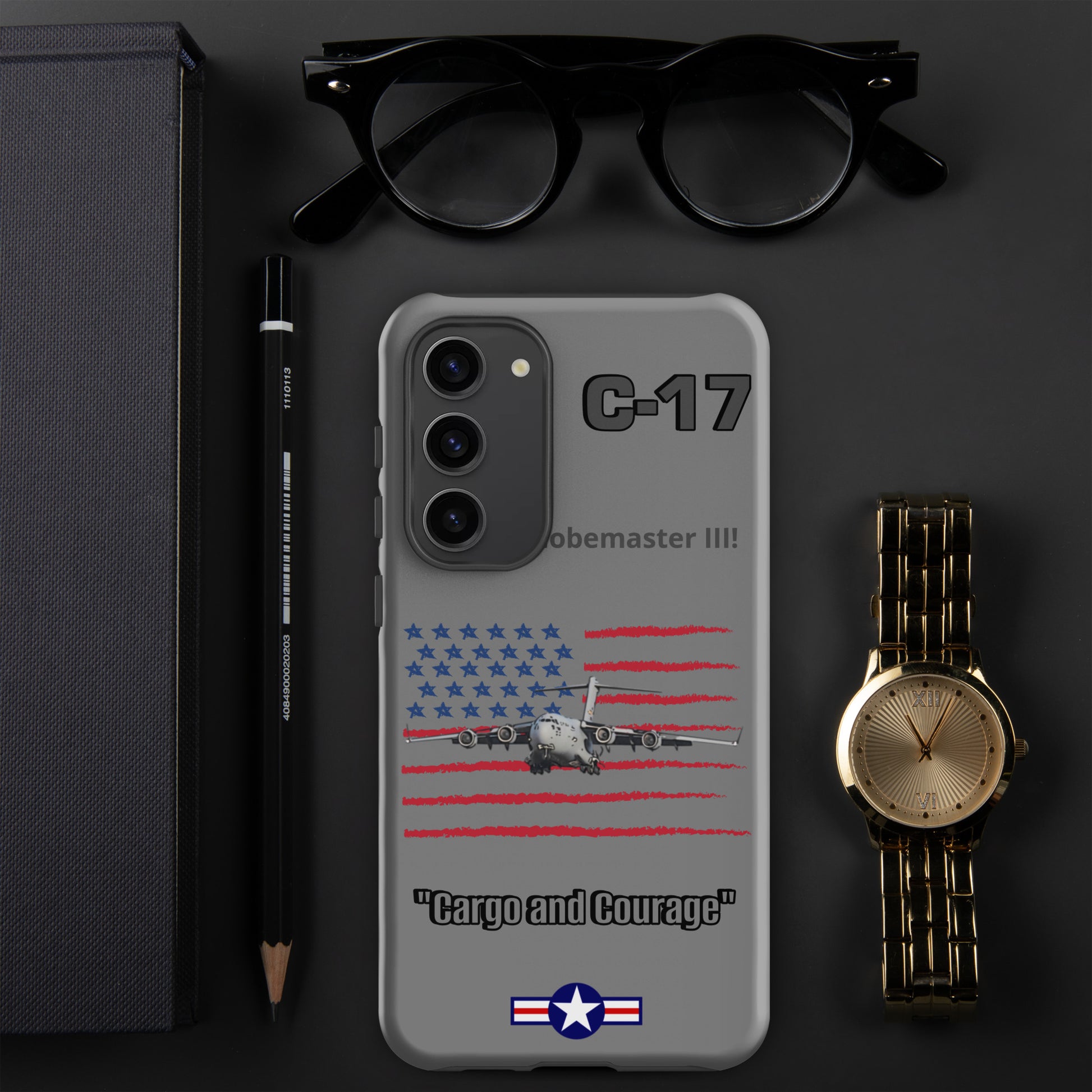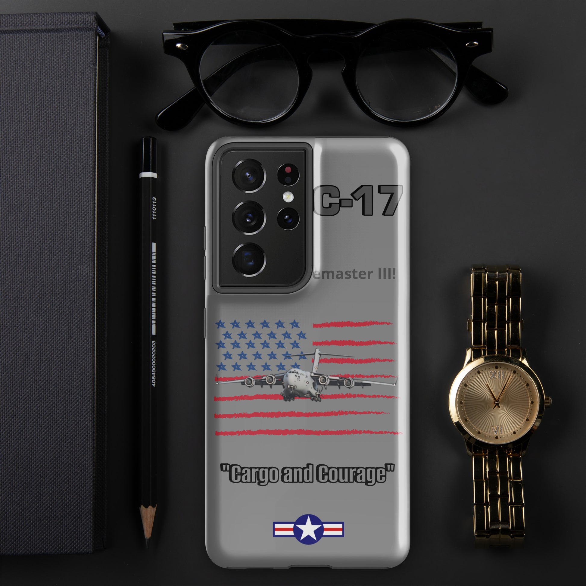 Elevate your Samsung device protection with our C-17 Globemaster Patriot Case. This design proudly showcases the iconic USA flag as the backdrop to the legendary C-17 Globemaster. Safeguard your device in style while celebrating the Globemaster's legacy as a symbol of American aviation excellence. Carry the spirit of aviation and patriotism wherever you go.