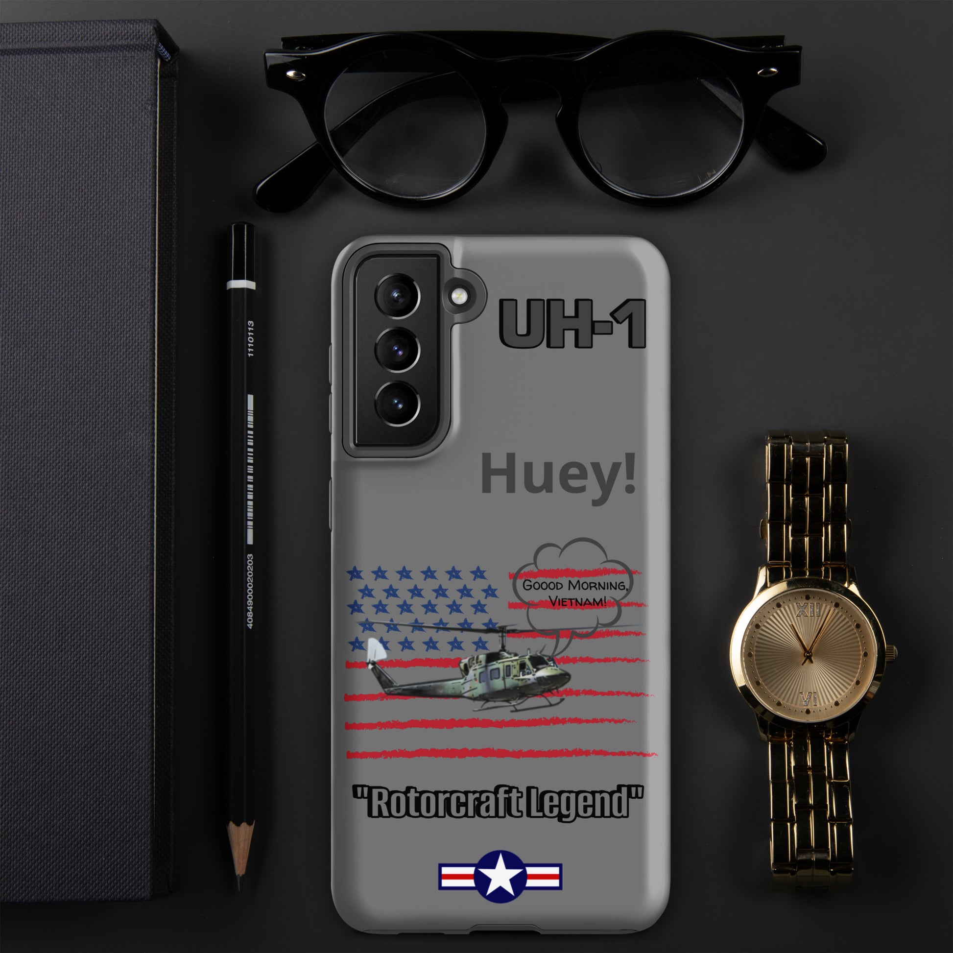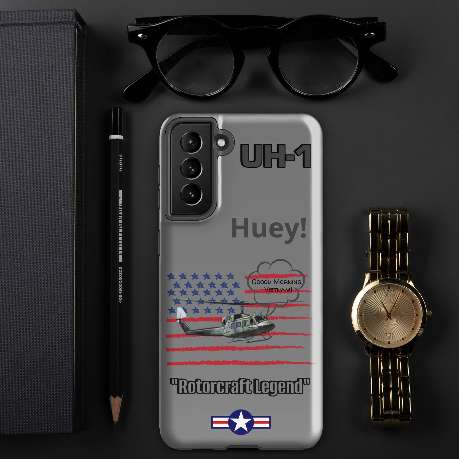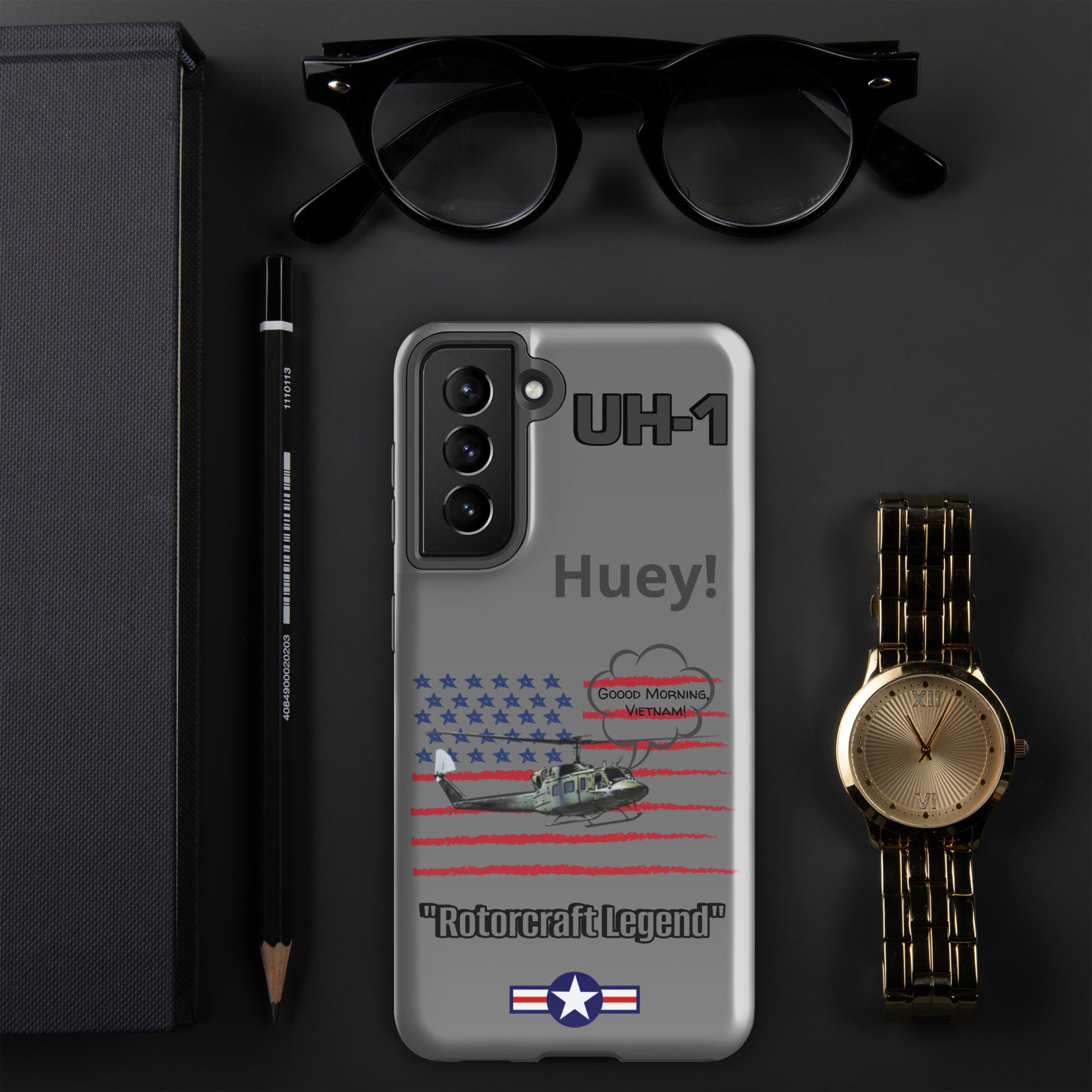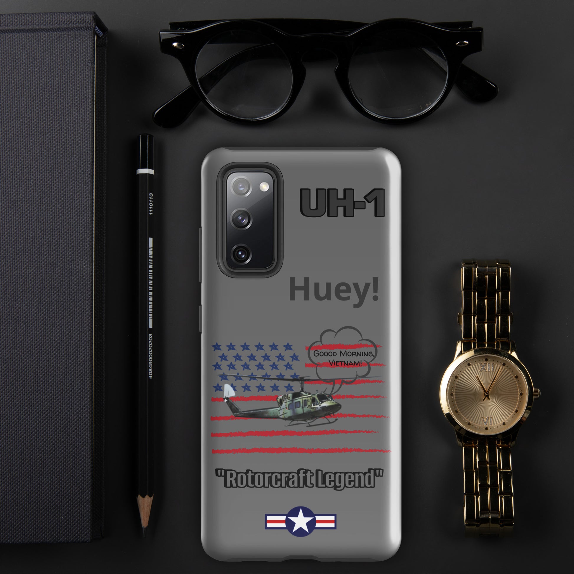 Elevate your device protection and embrace patriotism with our Bell UH-1 Iroquois Samsung case. Skillfully designed to shield your phone while showcasing the legacy of this iconic helicopter, our case harmonizes style and security with a touch of national pride. Carry your device confidently, embodying the power of aviation heritage and the USA's indomitable spirit. Unite protection and patriotism with every glance, honoring the rich history of aviation excellence.