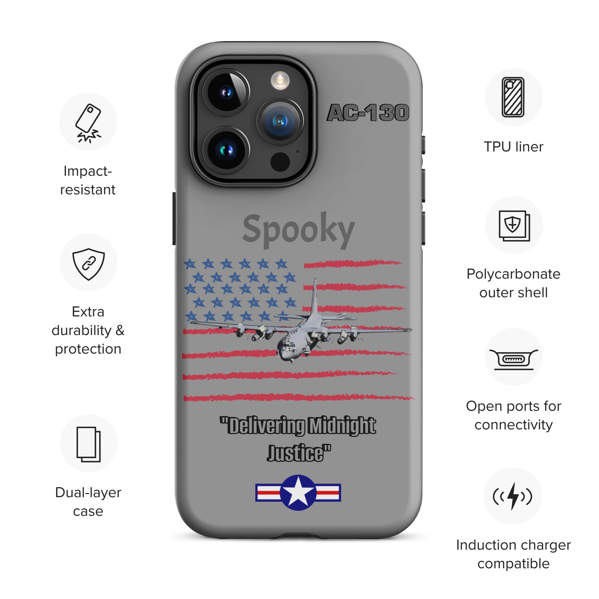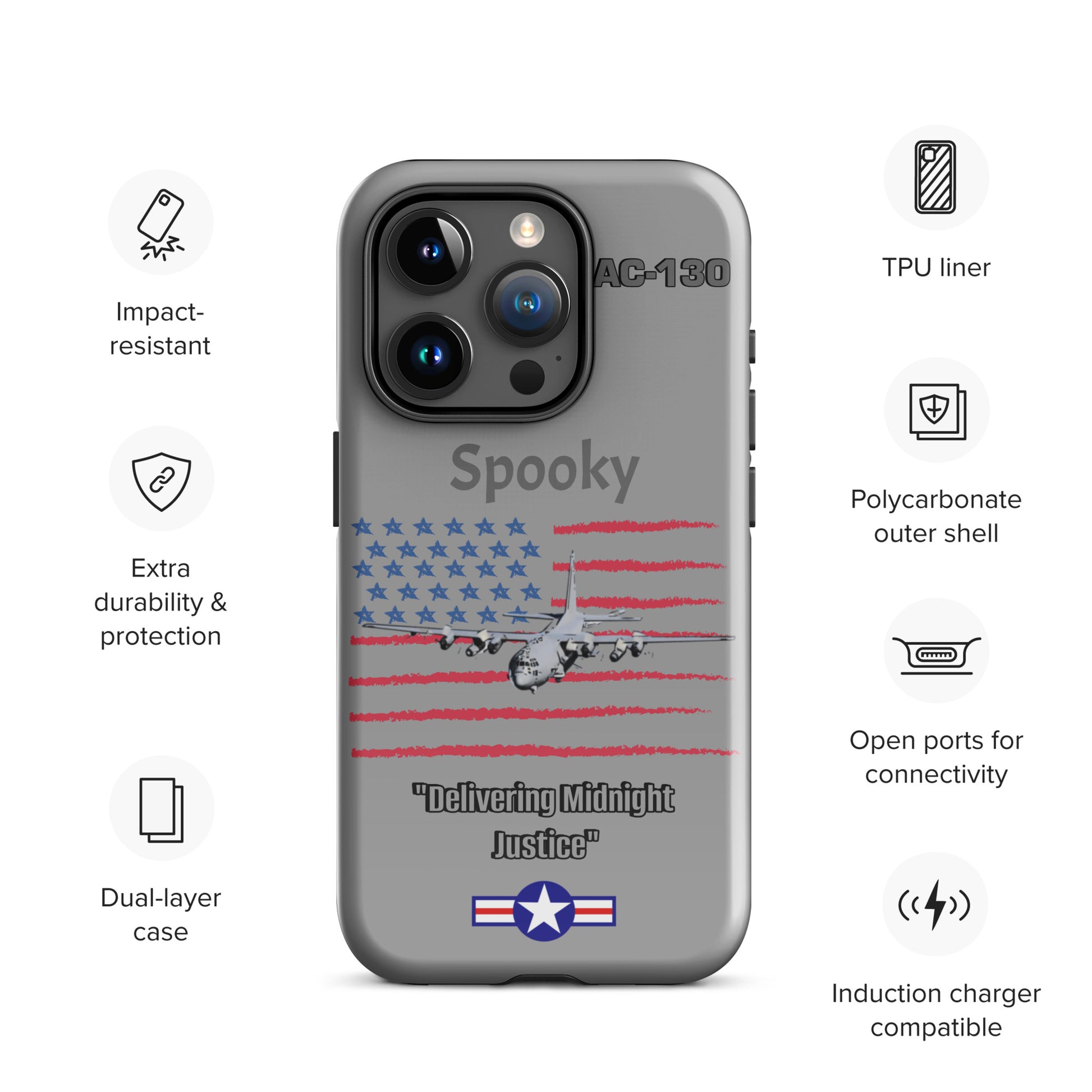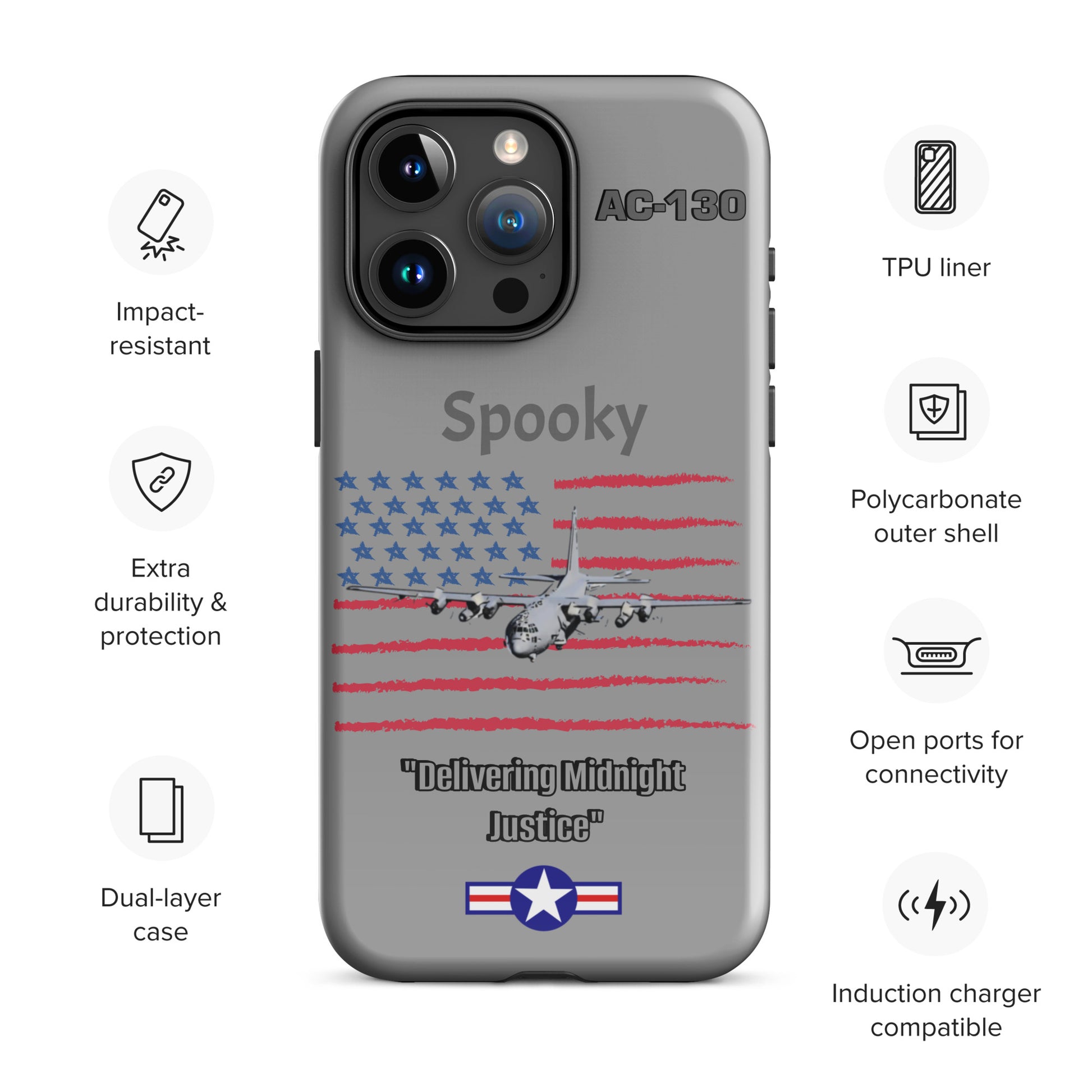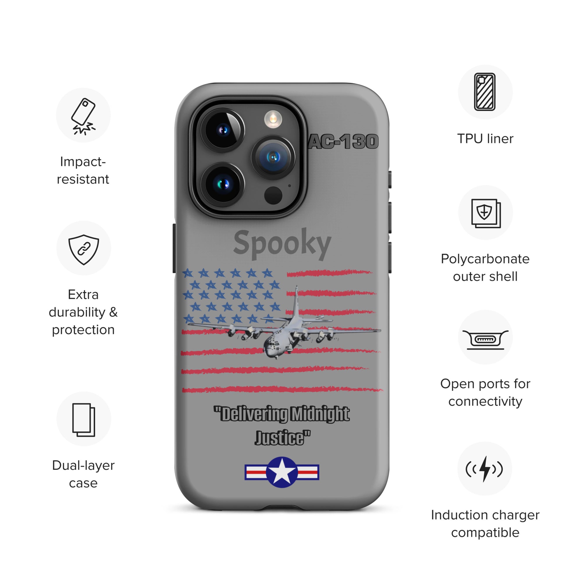 Elevate your device protection with our AC-130 Spooky Patriot iPhone Case. This design proudly features the iconic USA flag as a backdrop to the fearsome AC-130 Spooky gunship. Safeguard your phone in style while celebrating the Spooky's legacy as a symbol of American airpower. Carry the spirit of aviation and patriotism wherever you go.
