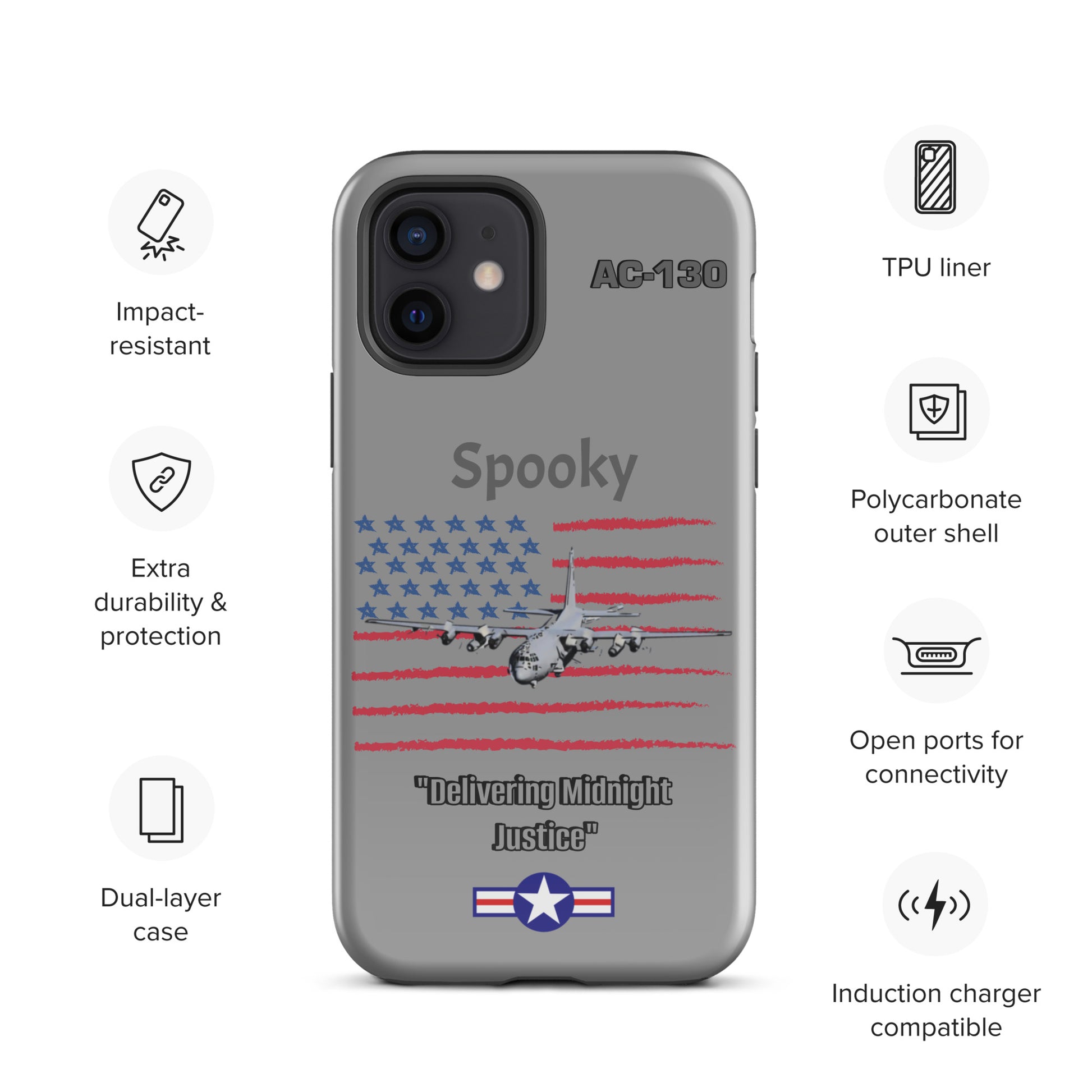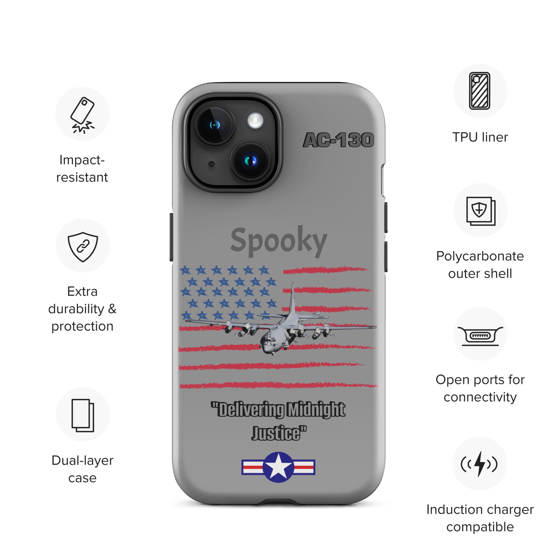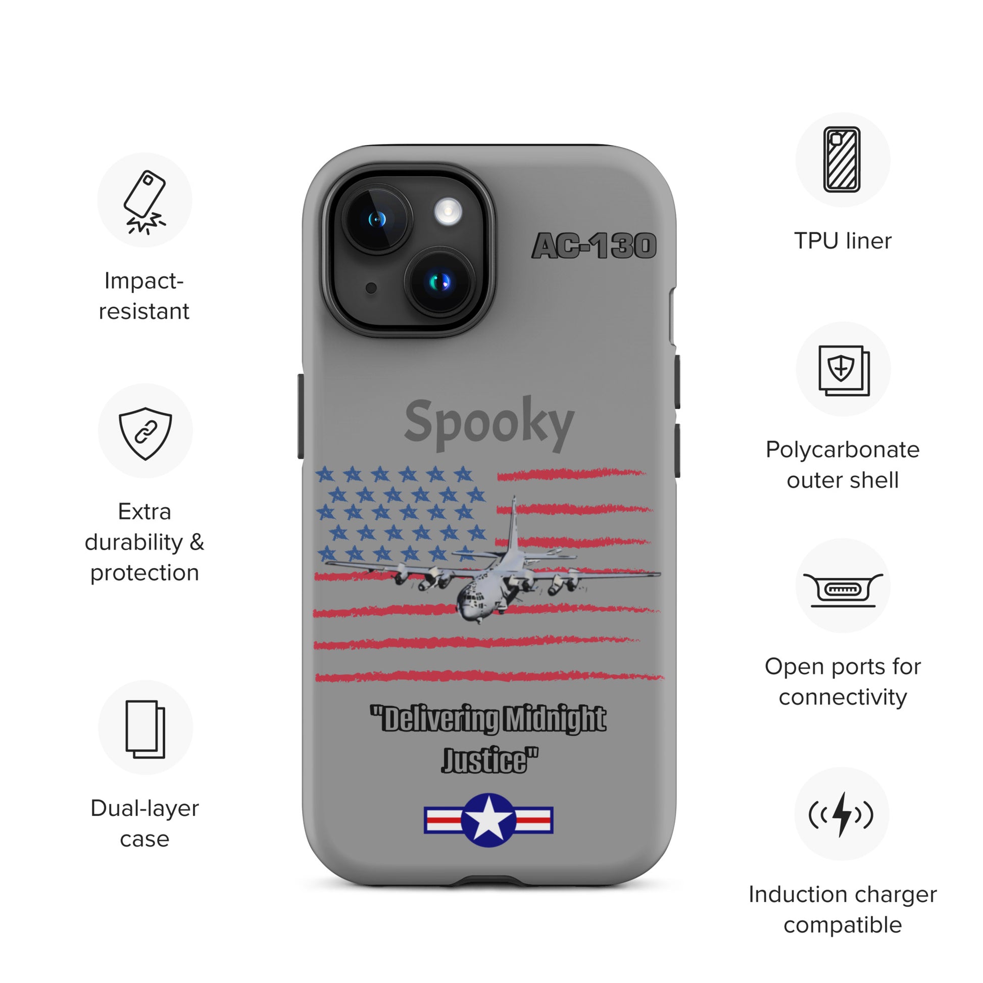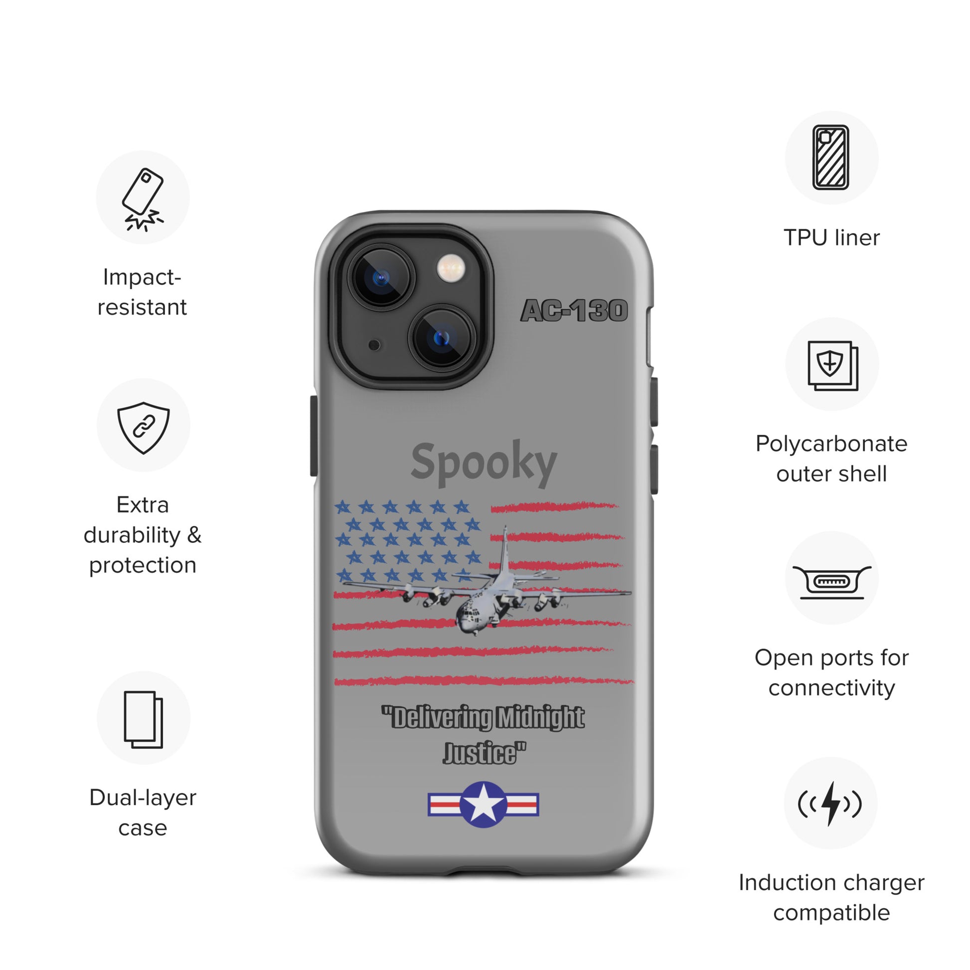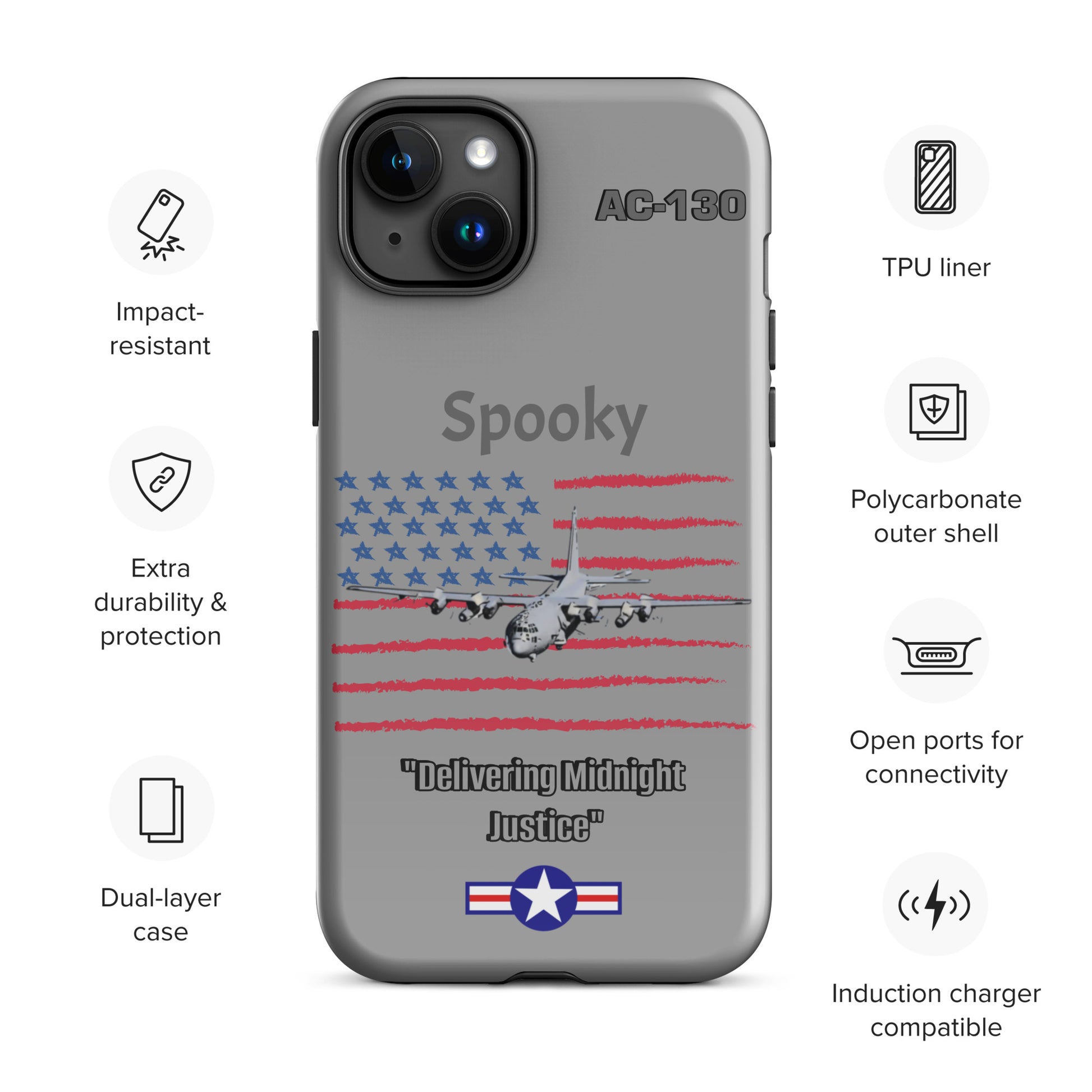 Elevate your device protection with our AC-130 Spooky Patriot iPhone Case. This design proudly features the iconic USA flag as a backdrop to the fearsome AC-130 Spooky gunship. Safeguard your phone in style while celebrating the Spooky's legacy as a symbol of American airpower. Carry the spirit of aviation and patriotism wherever you go.