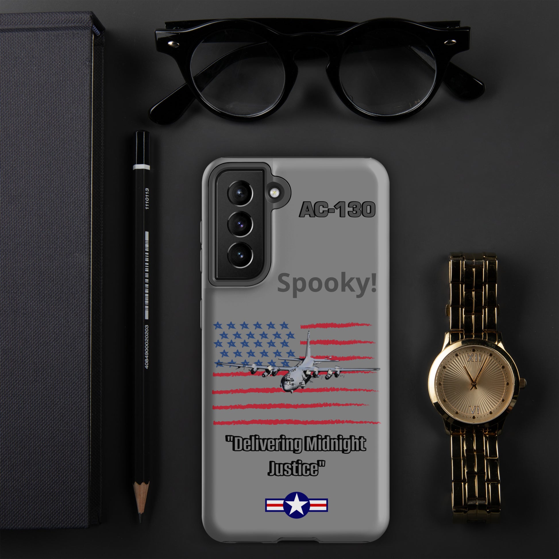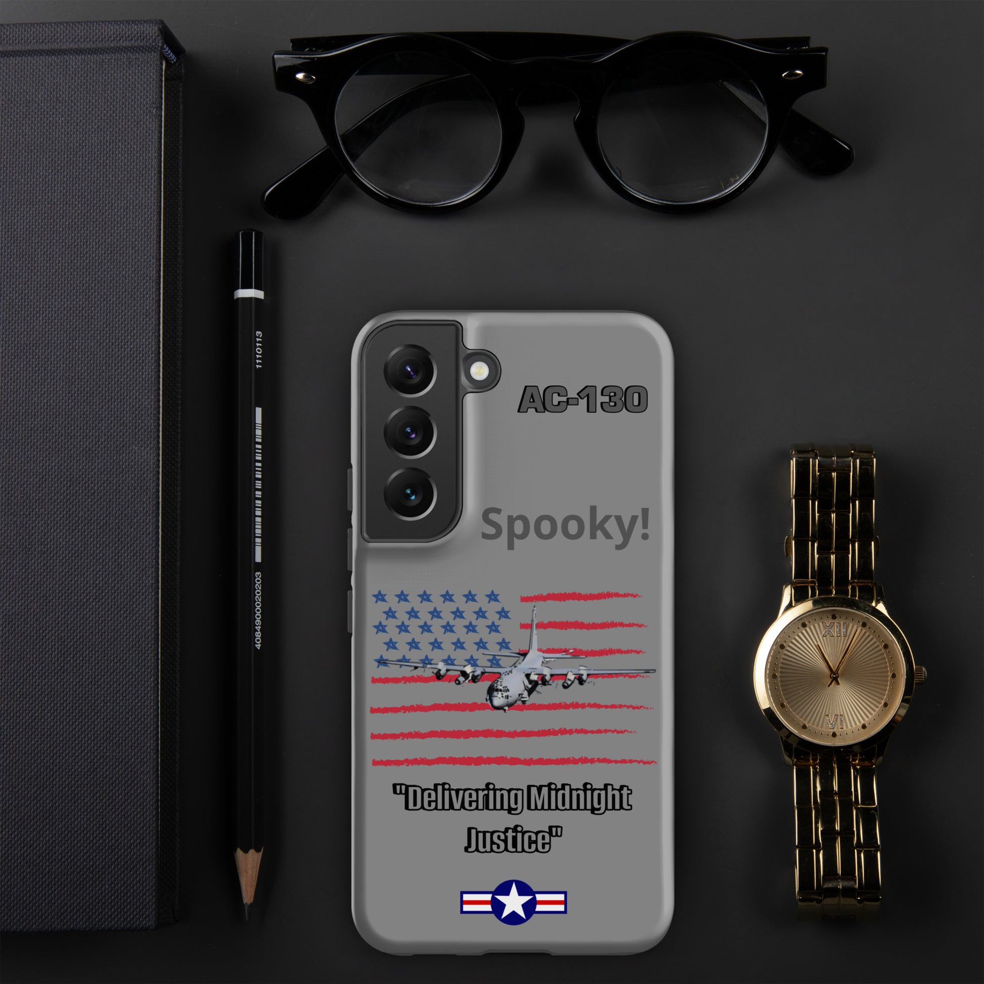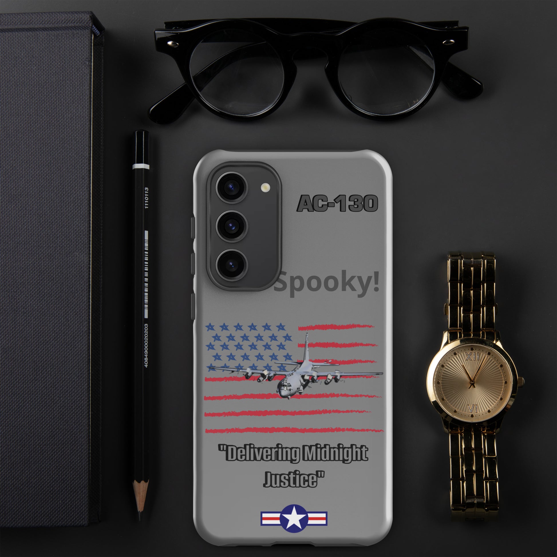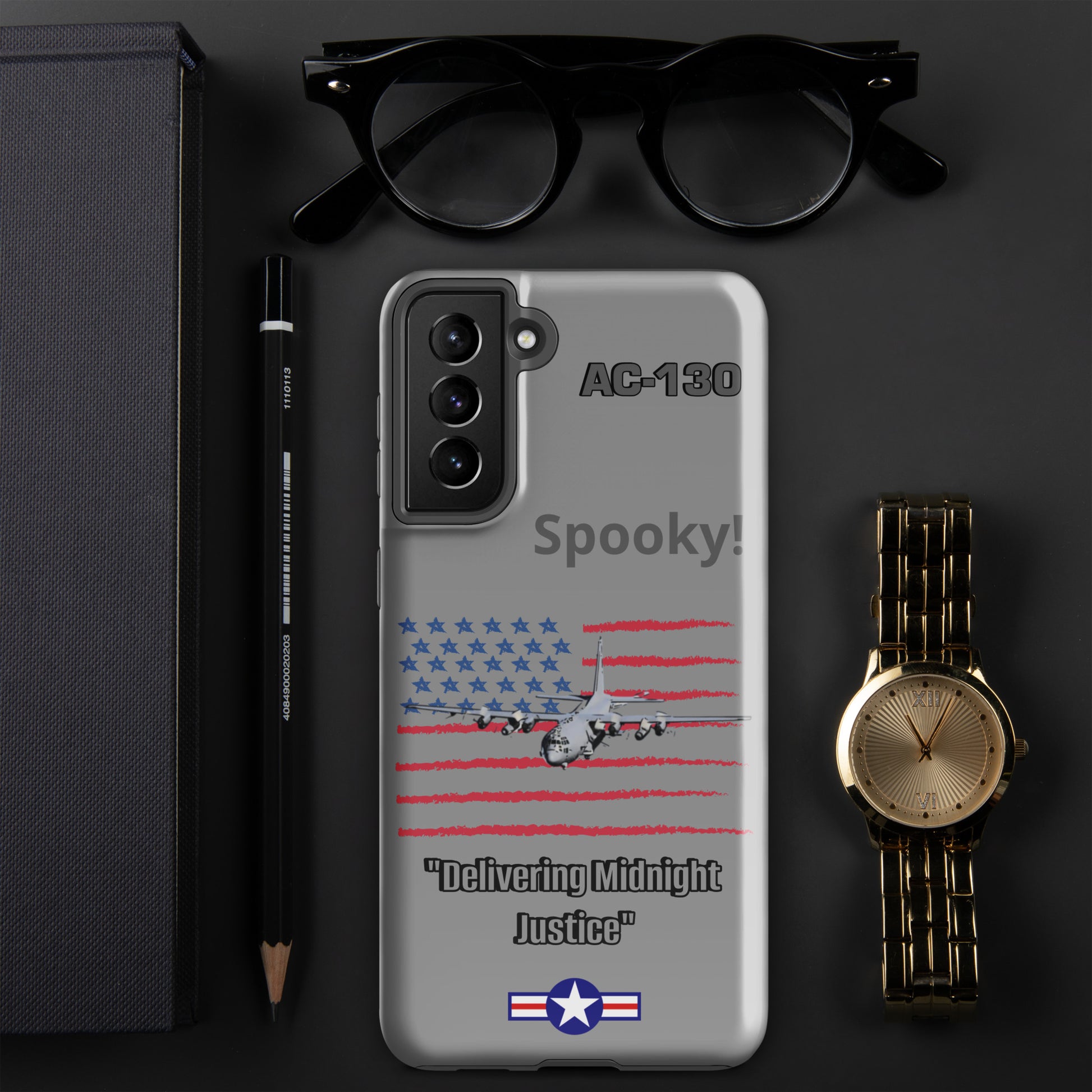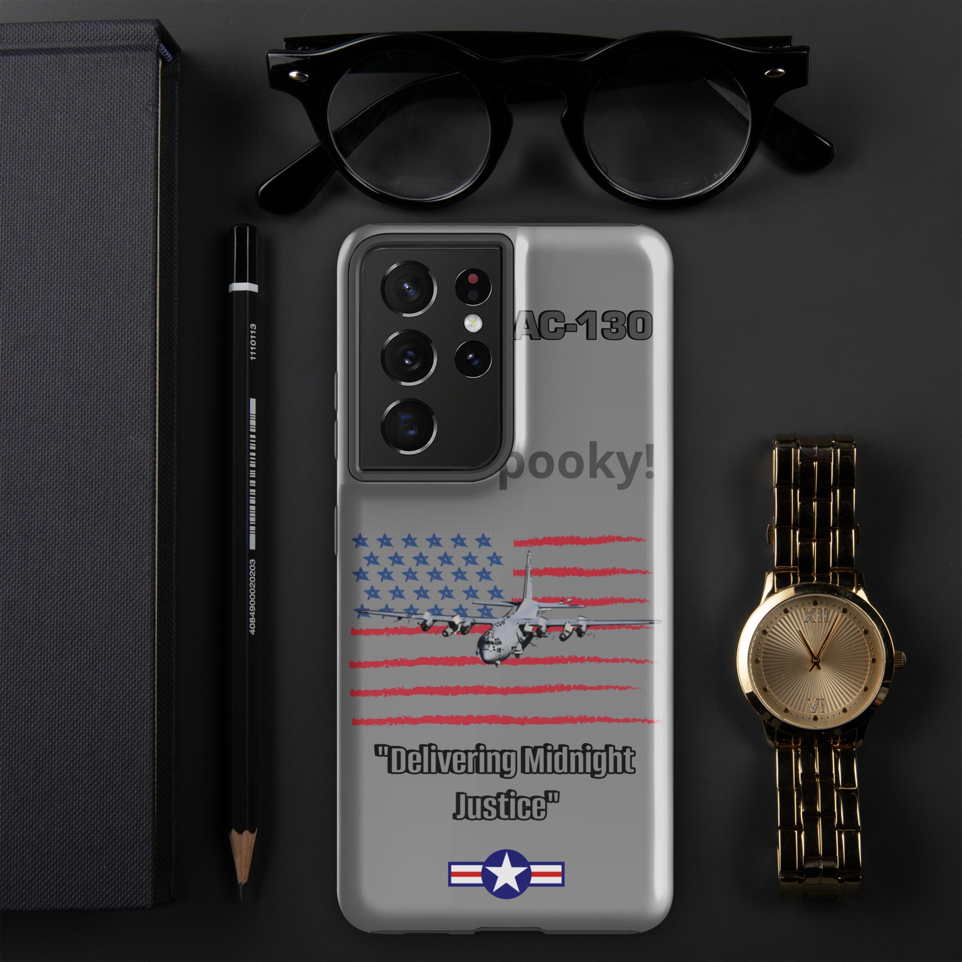 Elevate your device protection with our Samsung AC-130 Spooky Patriot Case. This design proudly features the iconic USA flag as a backdrop to the fearsome AC-130 Spooky gunship. Safeguard your phone in style while celebrating the Spooky's legacy as a symbol of American airpower. Carry the spirit of aviation and patriotism wherever you go.