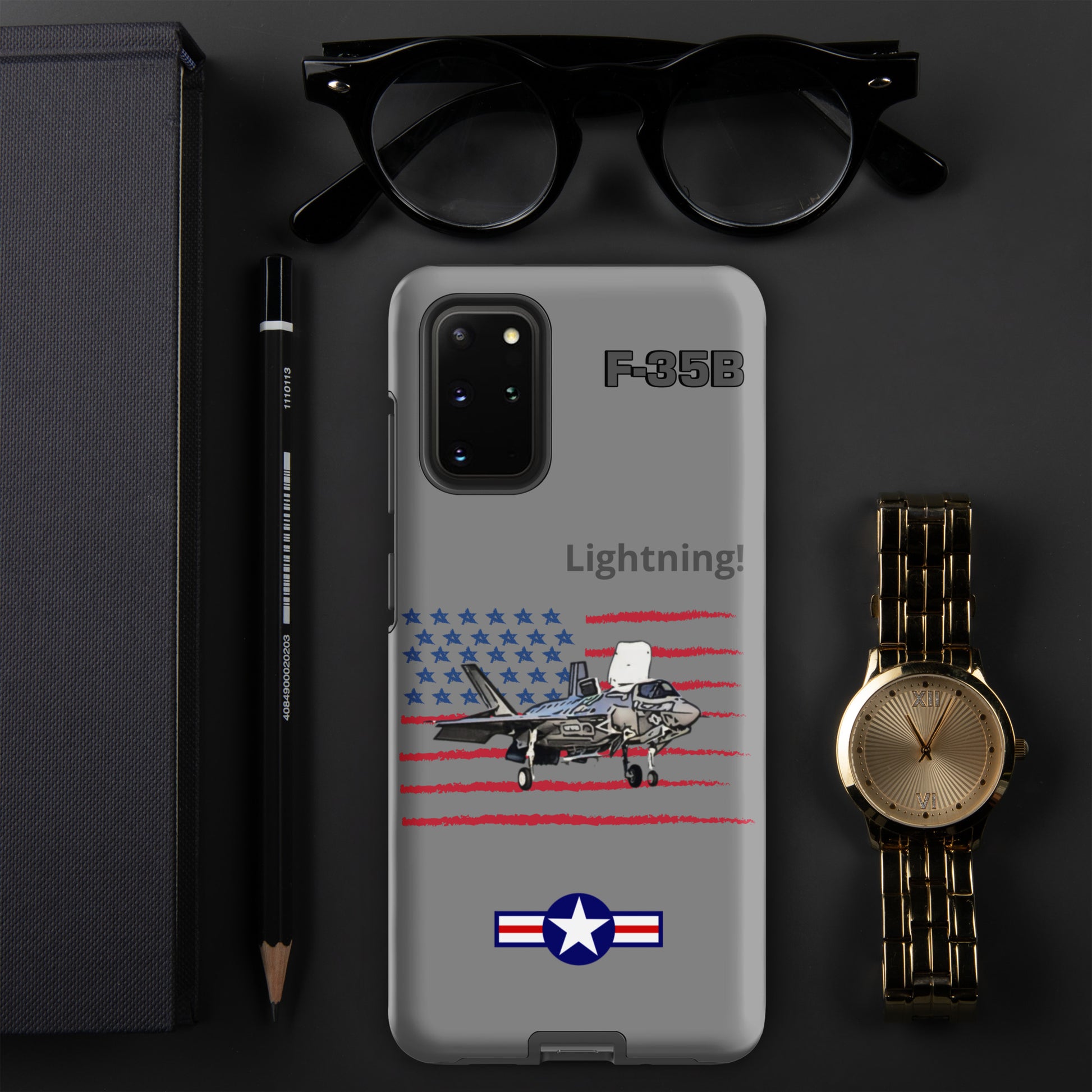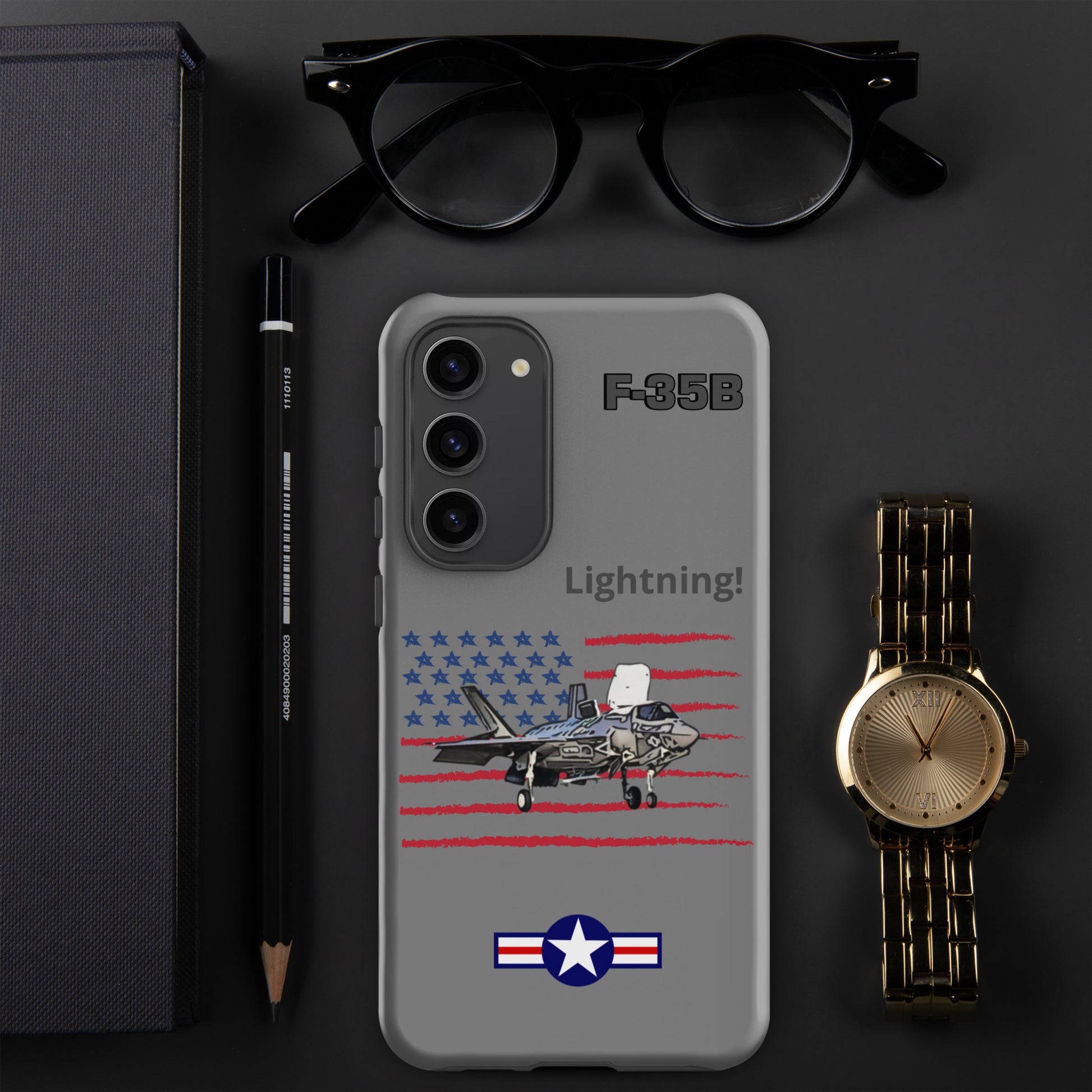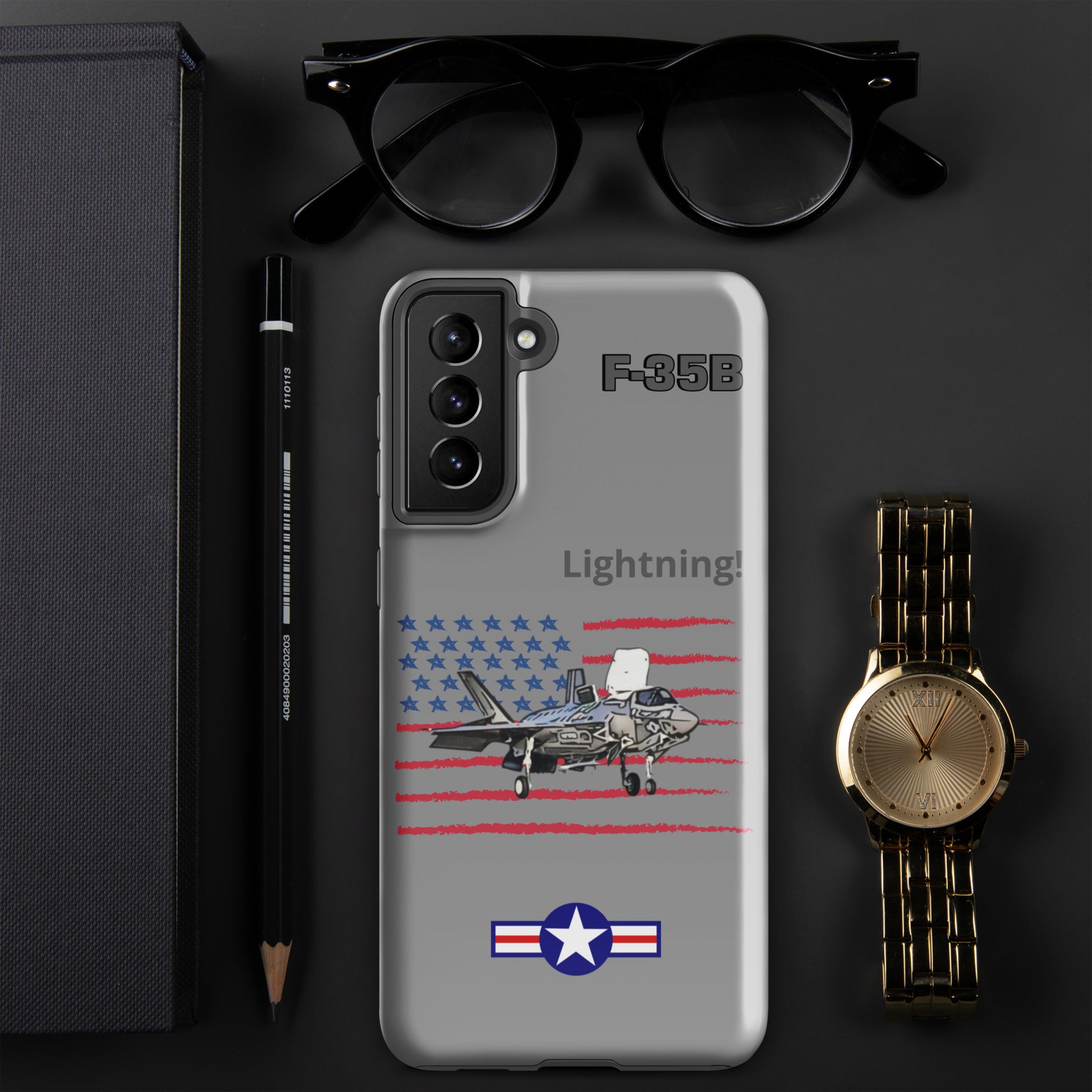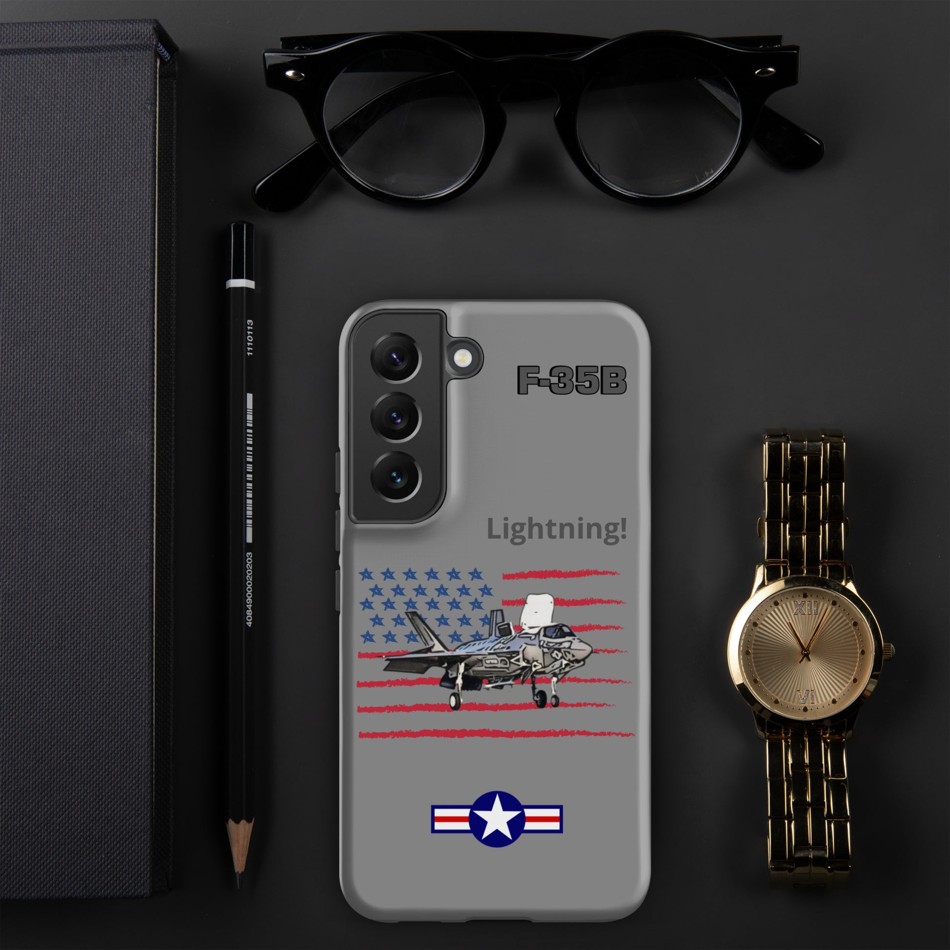 Elevate your device protection with our F-35B Lightning II Samsung case. Featuring a striking design of this vertical takeoff and landing marvel against the backdrop of the USA flag, it's the perfect blend of aviation power and patriotic pride. Crafted for both style and durability, this case is a must-have for aviation enthusiasts. Carry the spirit of the F-35B's vertical flight wherever you go.